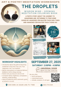 Universal Door Meditation Center invites you to join the special Awakened meditation retreat every Sunday, guided by Awakened Zen Master Thich Dieu Thien to awaken the inherent Buddha Nature within each person and directly experience the Ultimate Truth.