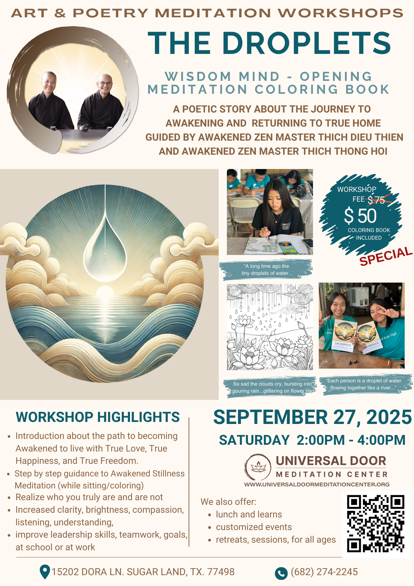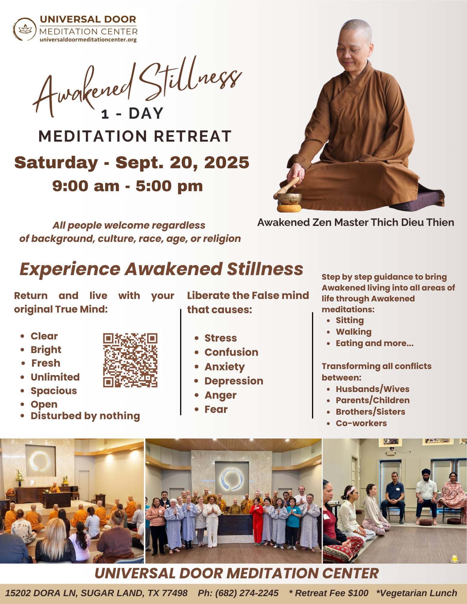 Universal Door Meditation Center invites you to join the special Awakened meditation retreat every Sunday, guided by Awakened Zen Master Thich Dieu Thien to awaken the inherent Buddha Nature within each person and directly experience the Ultimate Truth.